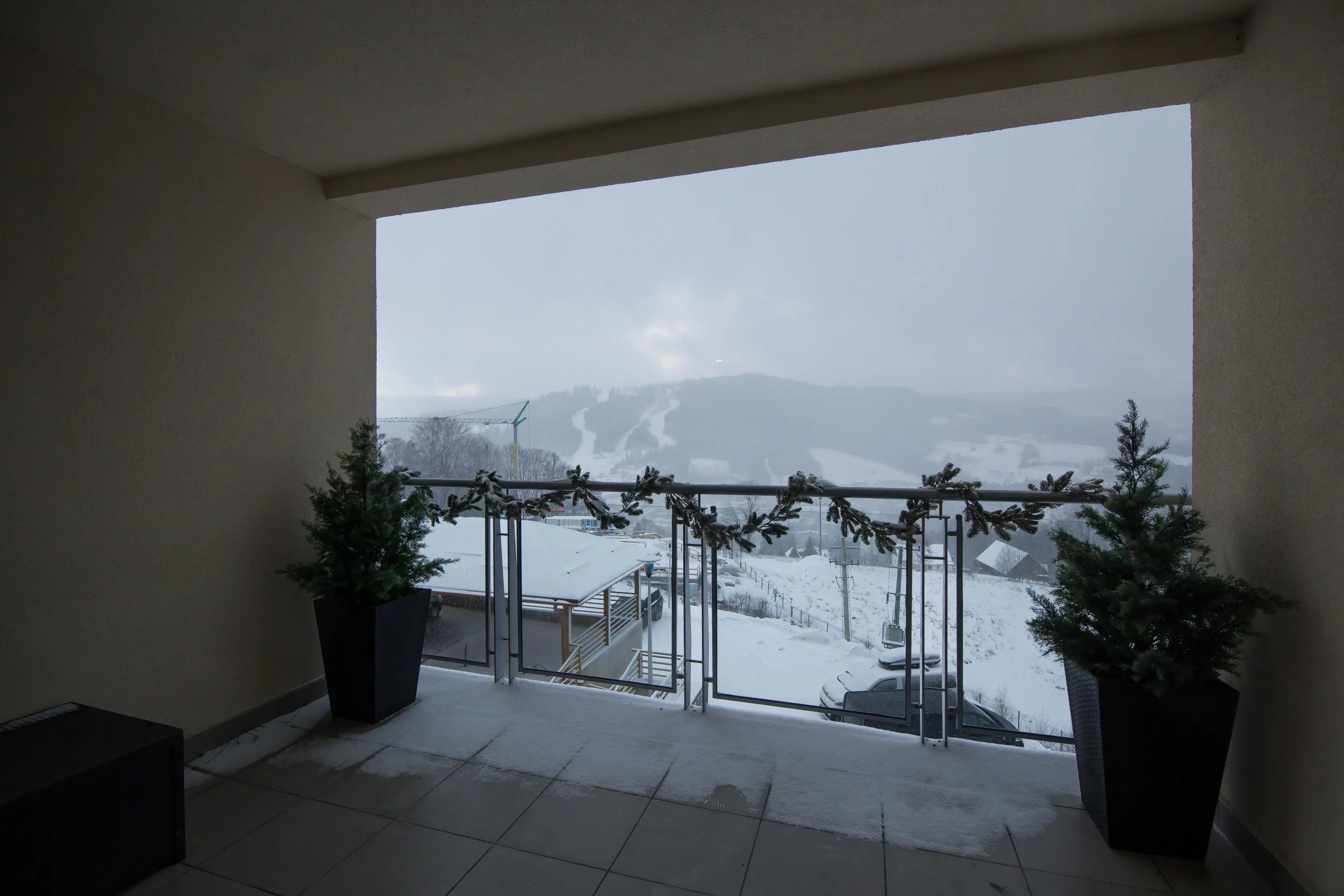 Budynek z nowoczesną szybką windą, zlokalizowany na zamkniętej posesji. Działka bardzo zadbane z dużą ilością nasadzonej zieleni a posadzone wysokie drzewa łączą posesję budynku z otaczającą przyrodą. Wjazd przez bramę sterowaną elektronicznie. Lokalizacja apartamentowca w Wiśle na południowo zachodnim stoku, wysoko w górze nad okolicą i centrum miasta. Gdy słońce zachodzi za Czantorią i w centrum zapada już zmrok na posesji apartamentowca jest jasno i słonecznie w ostatnich promieniach słońca.