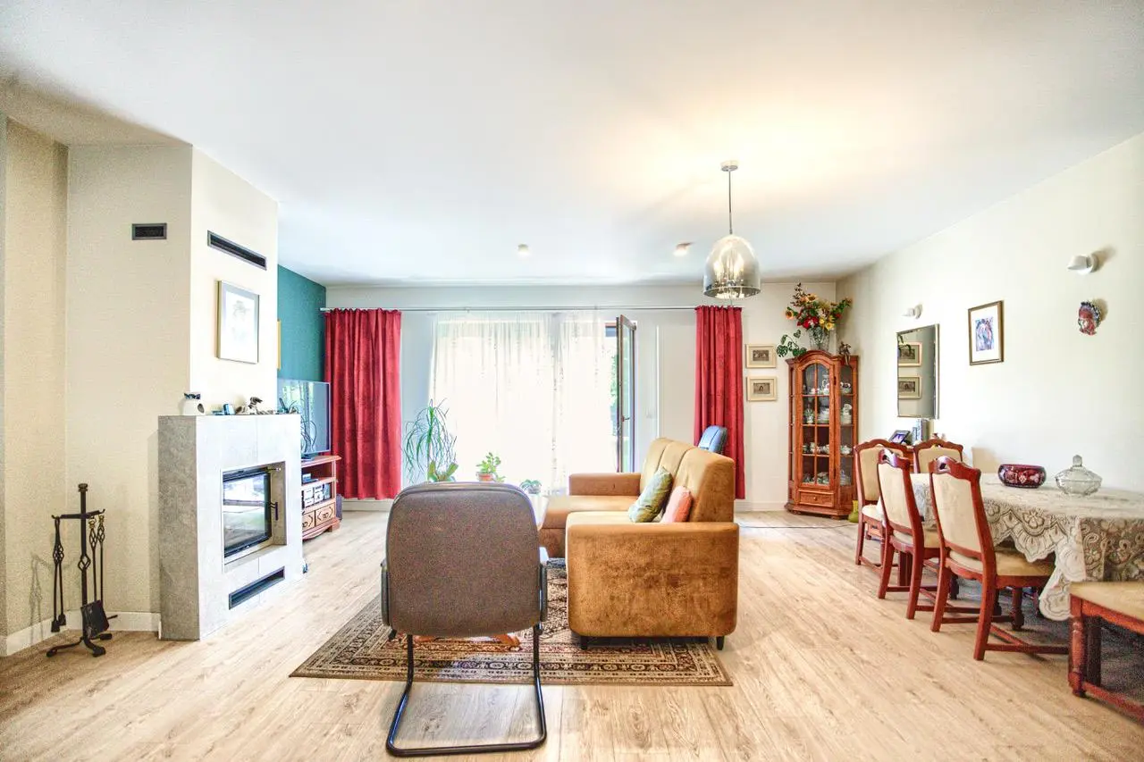 Dom komfortowo wykończony. W domu pozostają duże szafy, kuchnia, łazienki. Poddasze jest wykonczone w płyty osb. W salonie kominek. Ogród z tarasem, zagospodarowany.