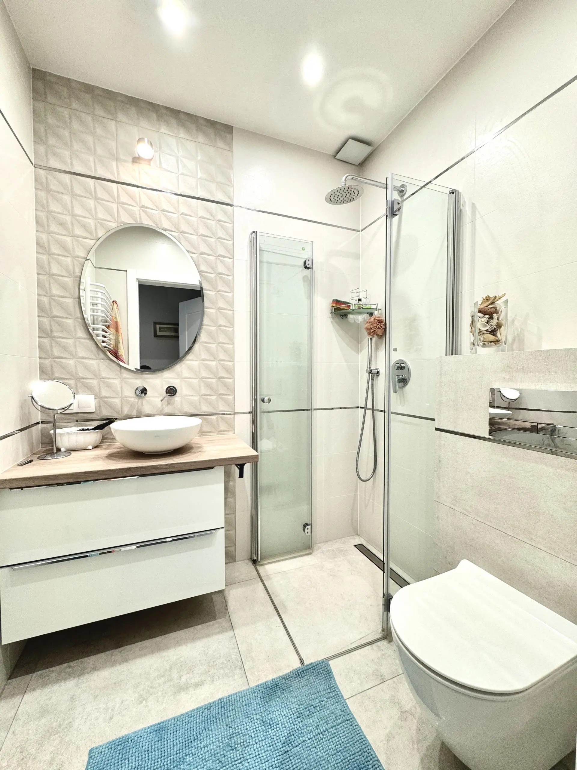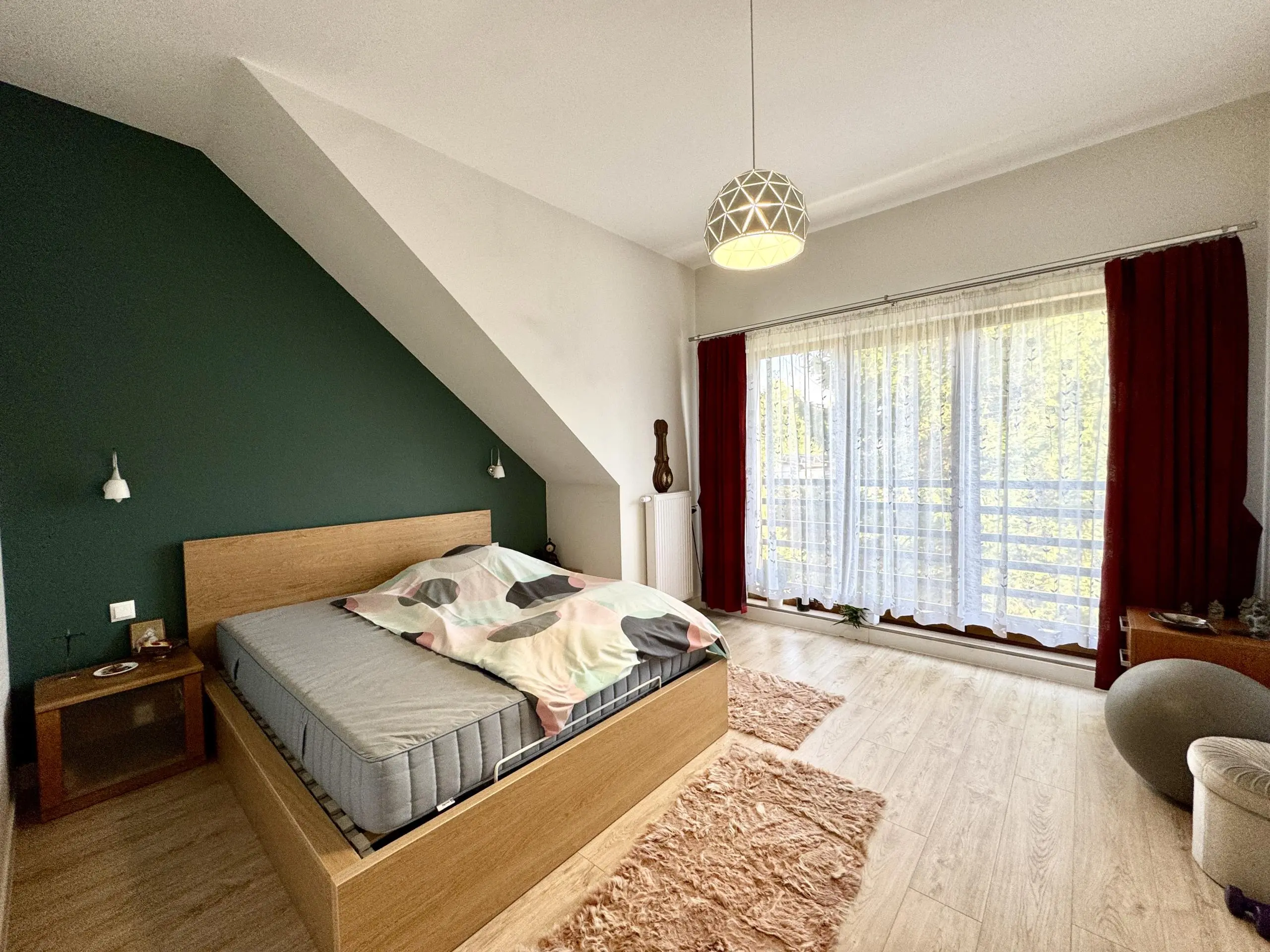 Rozkład pomieszczeń: przedpokój z którego przenosimy się do bardzo dużego salonu z aneksem kuchennym z oknem, ubikacja. Wchodząc po schodach na piętro mamy przestronna sypialnię z dużym oknem balkonowym i przestronną garderobą, 2 mniejsze pokoje, łazienka z wannę oraz prysznic, pralnia. Sporą niespodzianką jest poddasze, które nie jest uwzględnione w podanym metrażu. Dwa miejsca postojowe pod budynkiem.