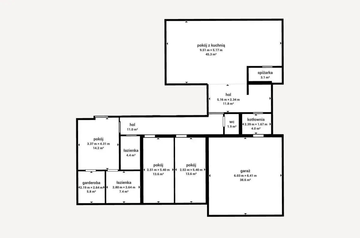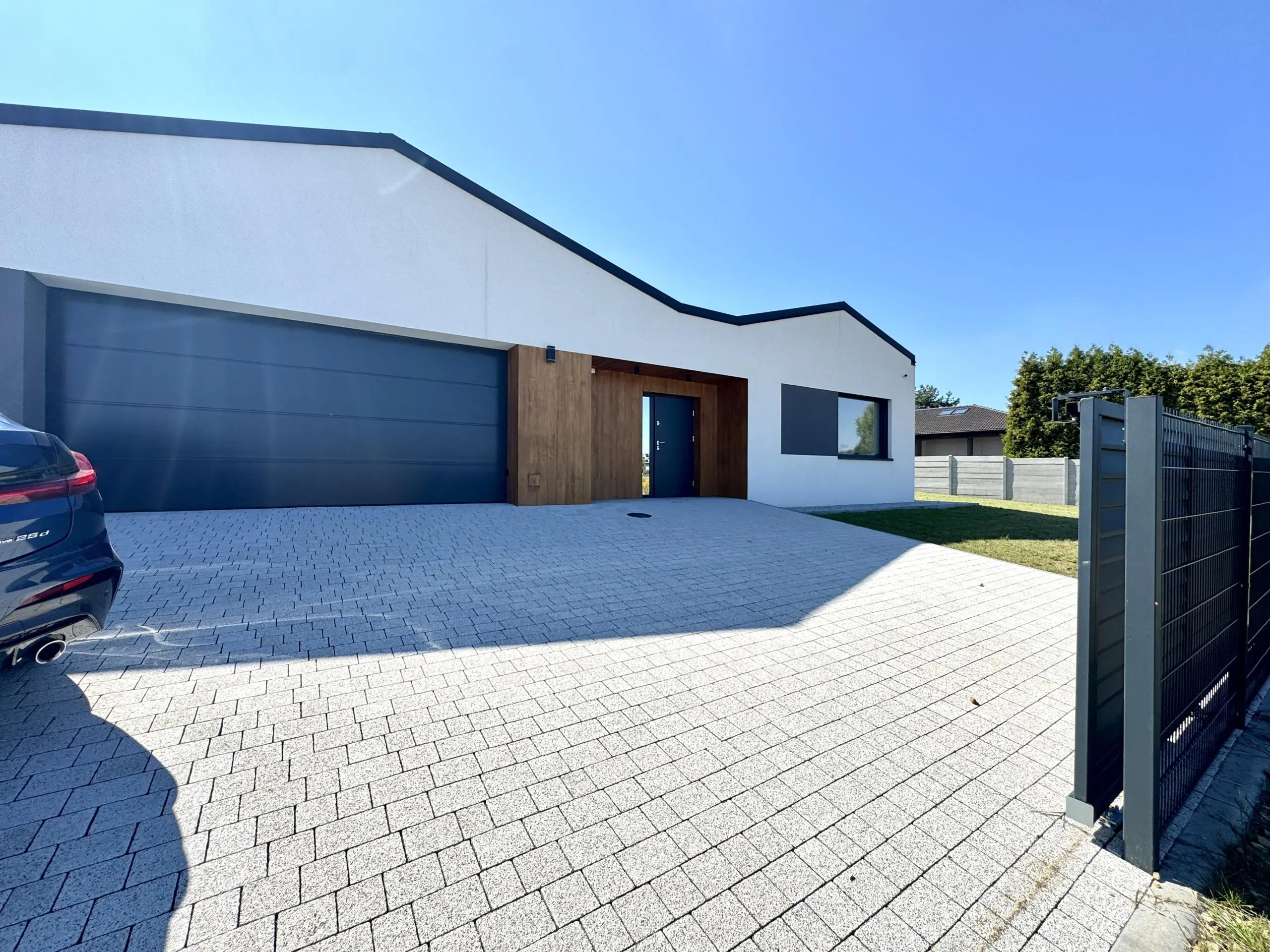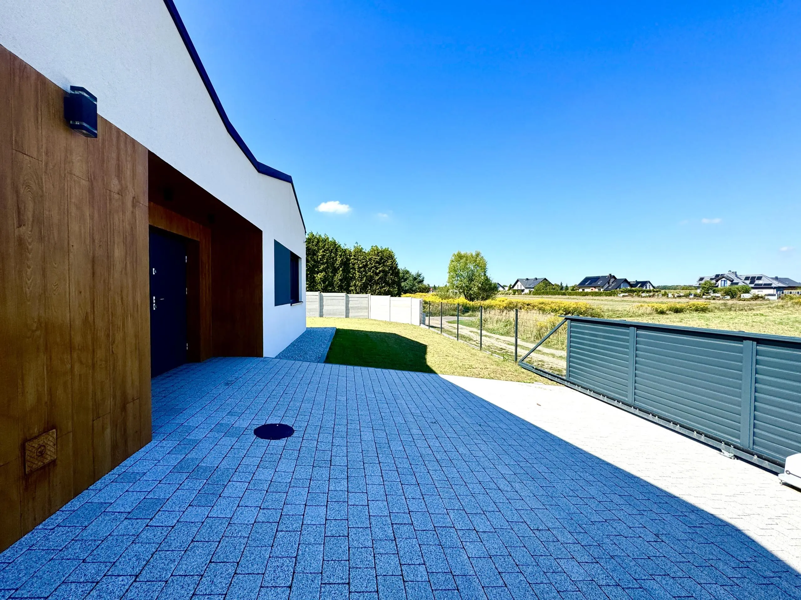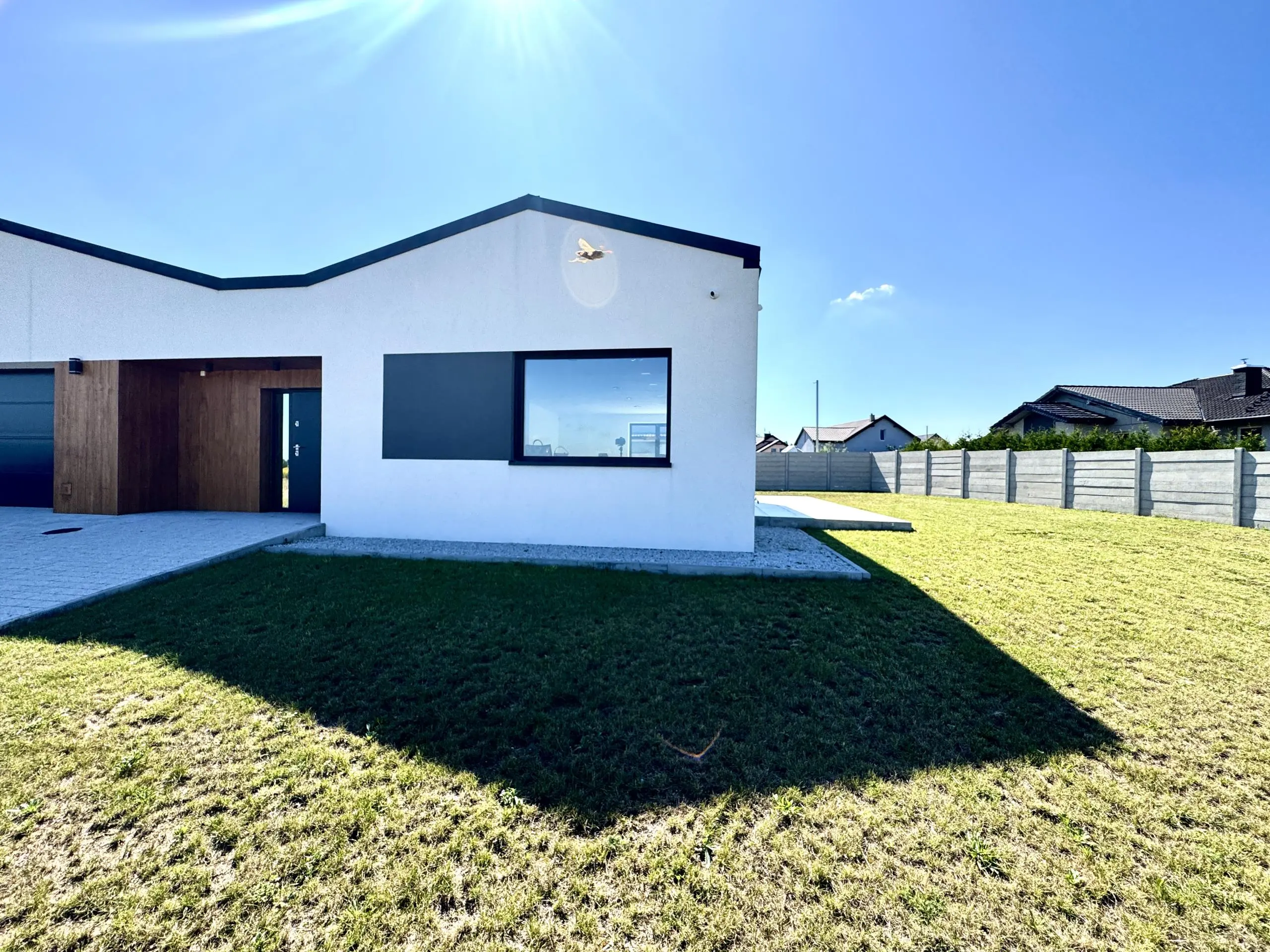Układ domu:Strefa dzienna: przestronny salon z jadalnią i otwartą kuchnią, spiżarnia, toaleta, wyjście na taras i patioStrefa nocna: 3 sypialnie, w tym jedna z prywatną łazienką i garderobą, dodatkowa łazienkaStrefa gospodarcza: wiatrołap, pralnia z pomieszczeniem technicznym, dwustanowiskowy garaż.