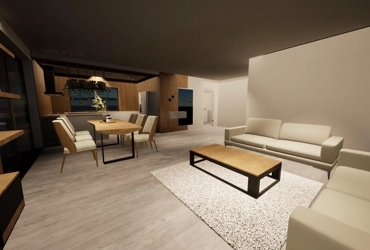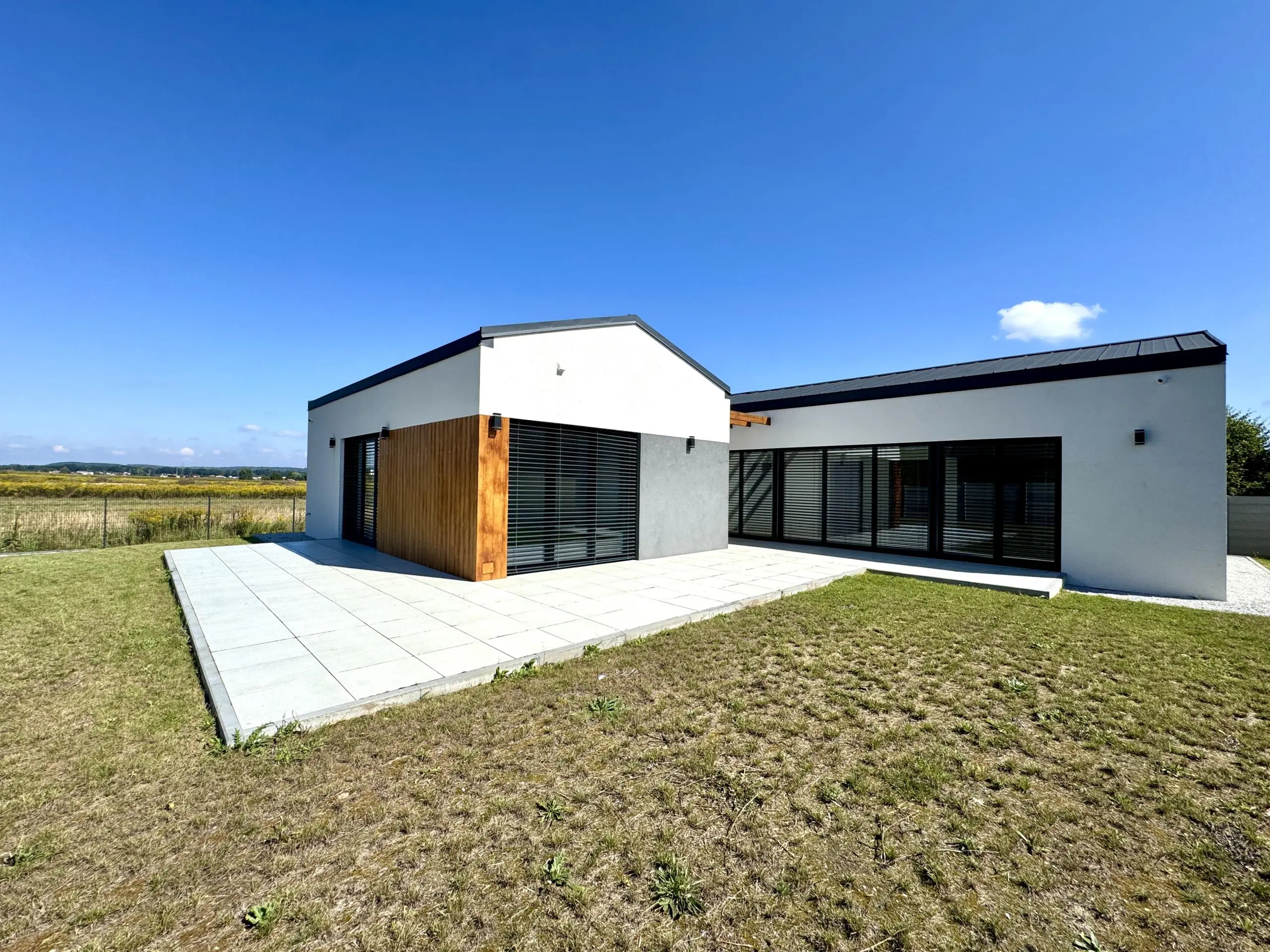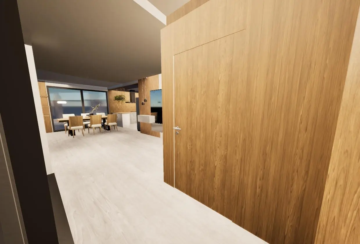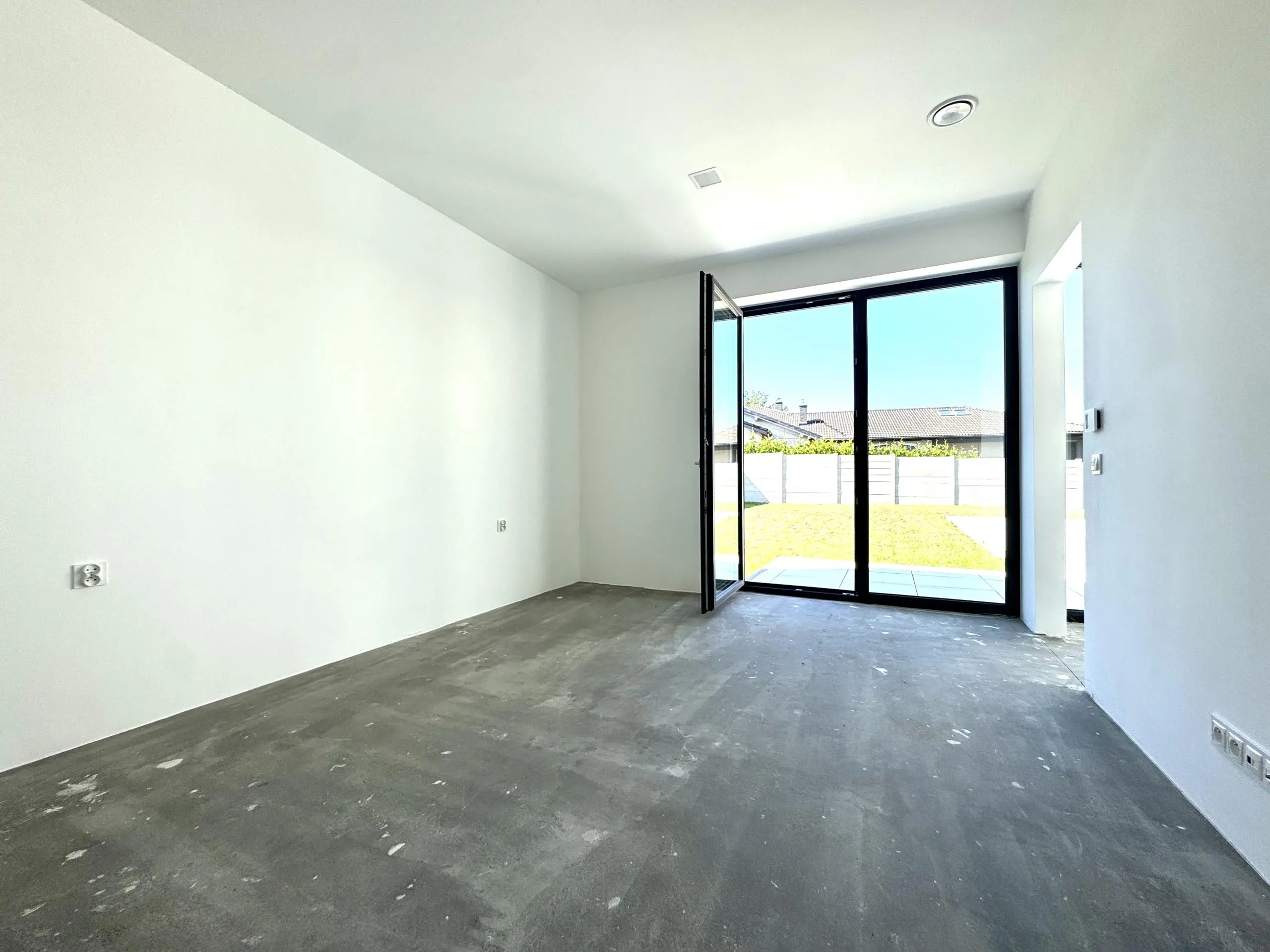Układ domu:Strefa dzienna: przestronny salon z jadalnią i otwartą kuchnią, spiżarnia, toaleta, wyjście na taras i patioStrefa nocna: 3 sypialnie, w tym jedna z prywatną łazienką i garderobą, dodatkowa łazienkaStrefa gospodarcza: wiatrołap, pralnia z pomieszczeniem technicznym, dwustanowiskowy garaż.