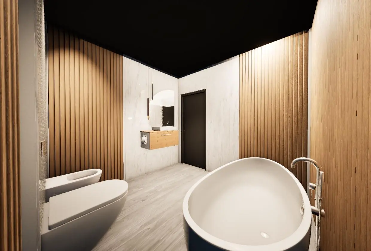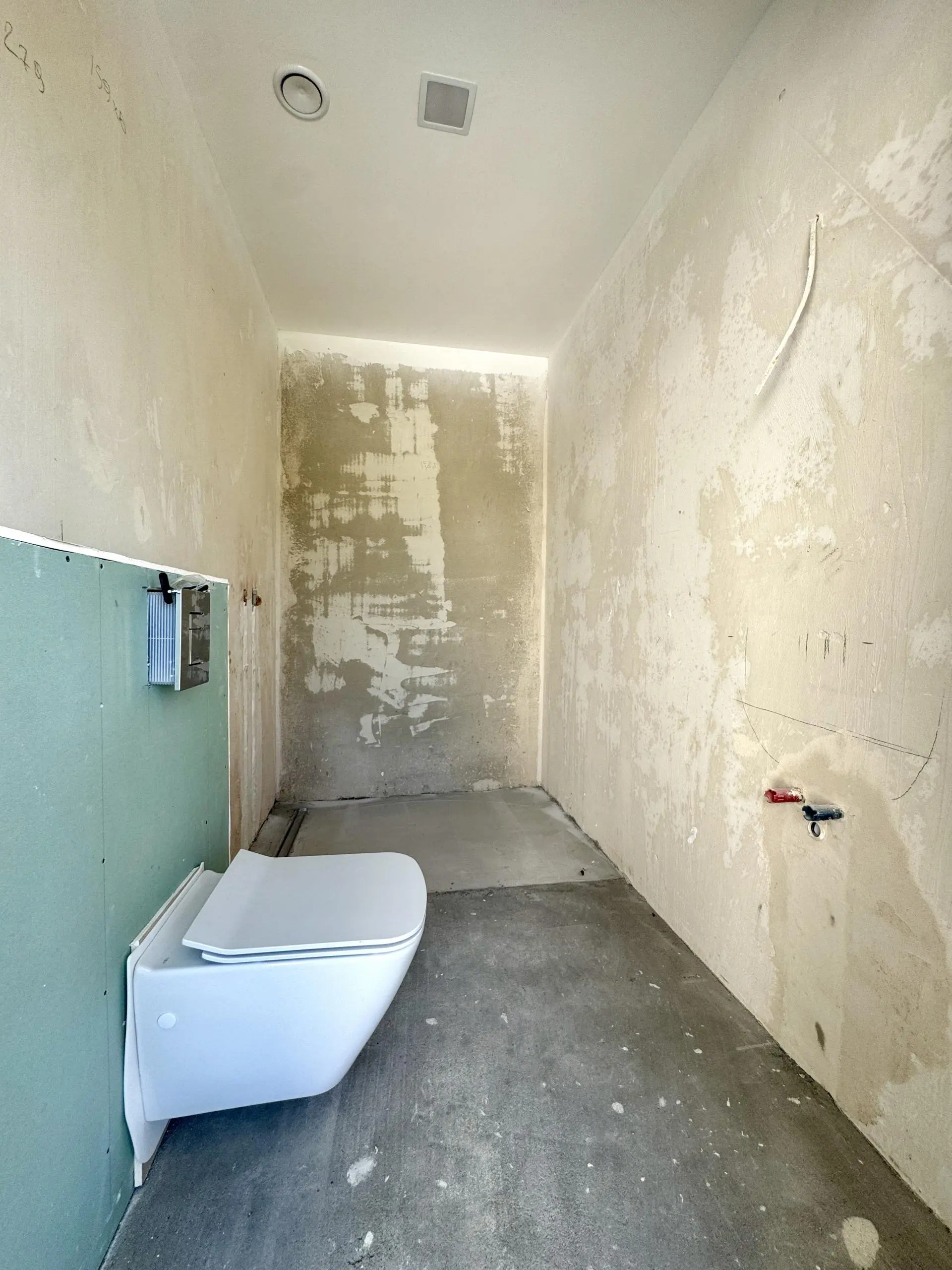 W łazienkach: biały montaż (stelaże WC, miski WC, bidet, odpływy, zabudowy K-G, hydroizolacja).